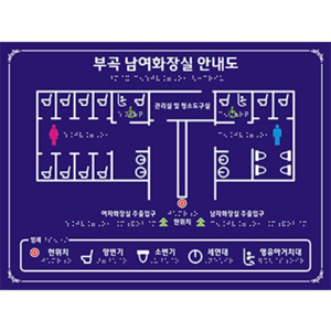 화장실용 촉지도는 벽면에 설치하며, 손끝으로 만져 확인할 수 있도록 촉각 점자와 기호가 도드라지게 표현됩니다. 구매 시 필요에 따라 크기와 재질을 선택할 수 있습니다.